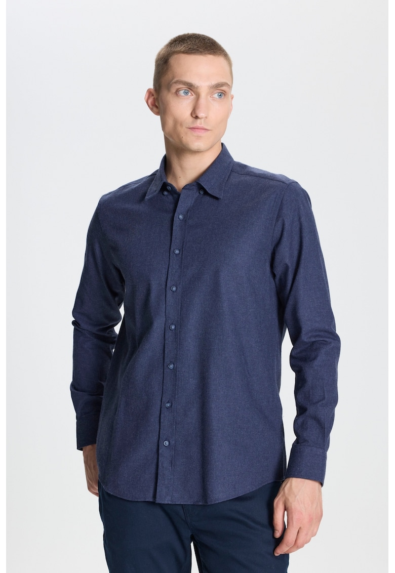 Характеристики Цвят: тъмносин Материал: синтетичен Принт: без принт Стил: ежедневен Кройка: стандартна Яка: заострена Дължина ръкав: дълъг ръкав Закопчаване: копчета Състав Външна част: 48% акрил – 39% полиестер – 13% памук