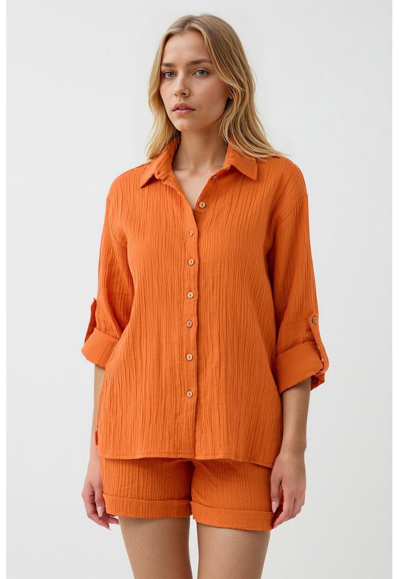 Характеристики Цвят: мандарина Принт: без принт Стил: ежедневен Материал: синтетичен – памук Кройка: стандартна Яка: заострена Дължина ръкав: дълъг ръкав Детайли: релефна повърхност Закопчаване: копчета Състав Външна част: 99% памук – 1% еластан