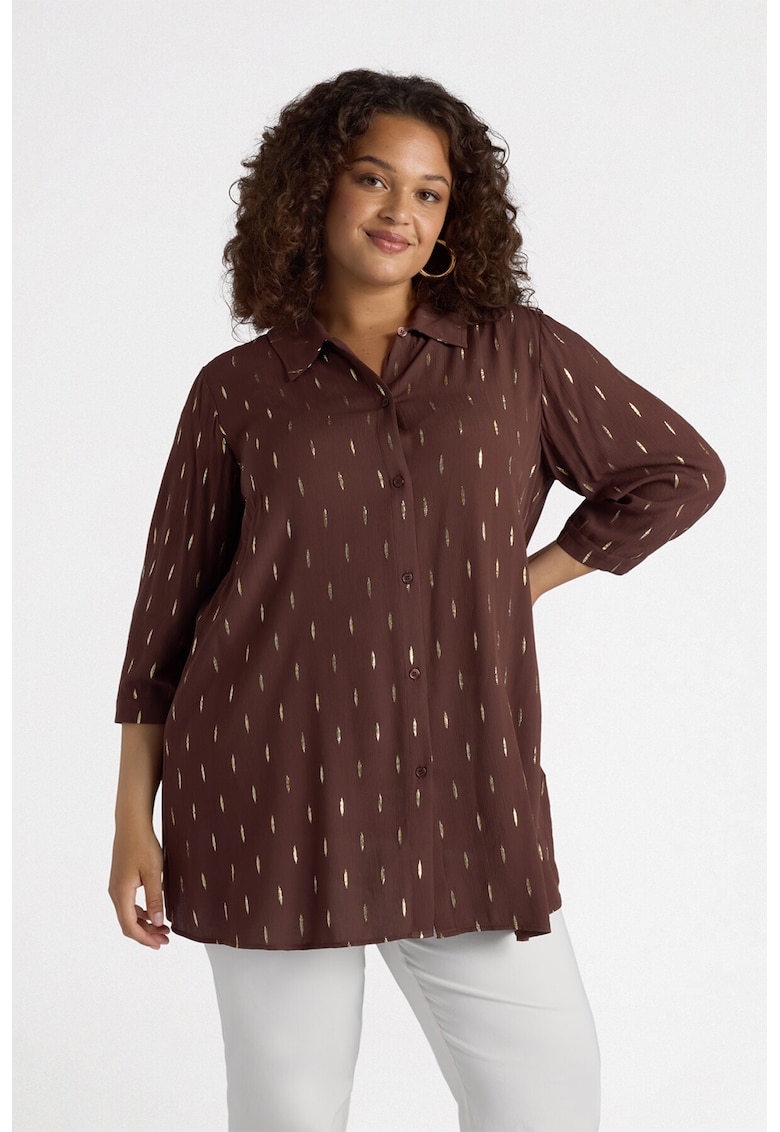 Характеристики Цвят: тъмнокафяв – бледожълт Принт: без принт Стил: ежедневен Материал: вискоза Кройка: стандартна Яка: класическа Дължина ръкав: три четвърт Детайли: този продукт е предназначен за дами с пищни форми (плюс размер). Състав Външна част: 98% вискоза – 2% …