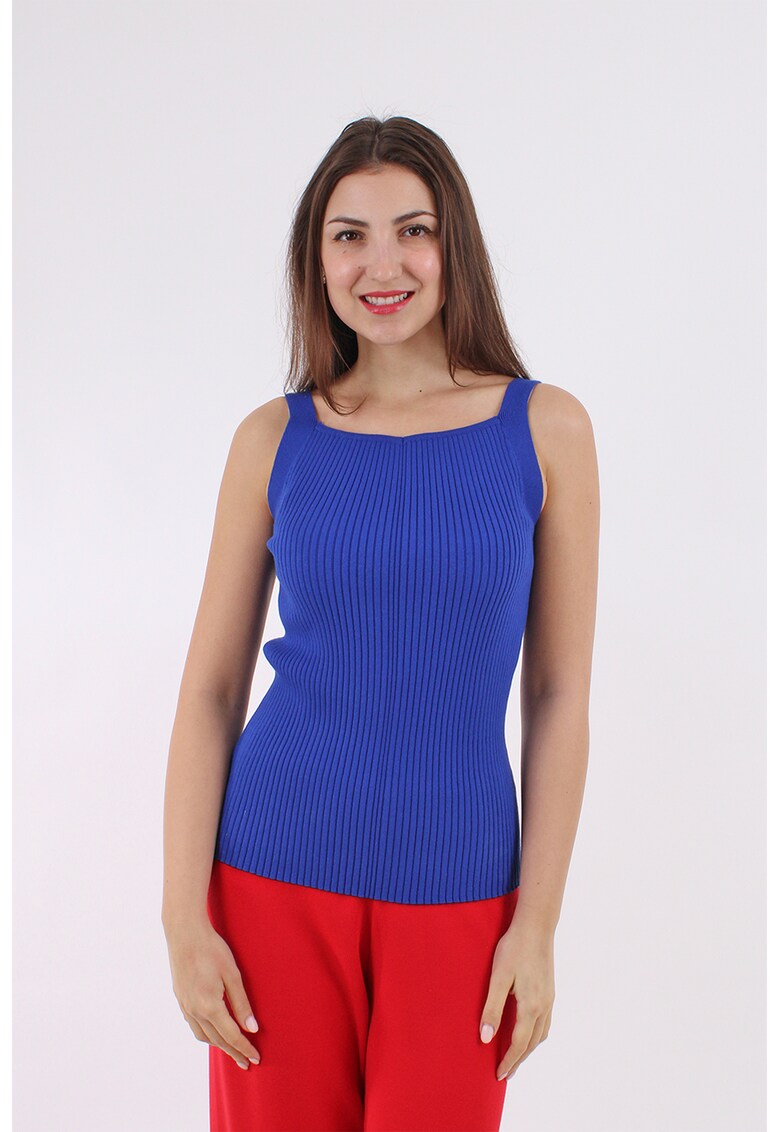 Характеристики Цвят: кралско синьо Принт: без принт Стил: ежедневен Кройка: по тялото Закопчаване: без закопчаване Материал: вискоза – полиамид Деколте: квадратно Дължина ръкав: без ръкав Детайли: релефна повърхност Състав Външна част: 70% вискоза – 30% полиамид