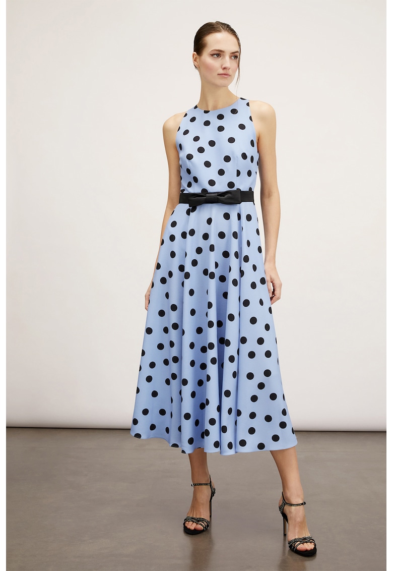 Характеристики Цвят: черен – светлосин Стил: елегантен Материал: синтетичен Принт: точки Кройка: разкроена Дължина: средна Деколте: кръгло Дължина ръкав: без ръкав Детайли: панделка Закопчаване: цип Състав Външна част: 94% полиестер – 6% еластан Подплата: 100% полиестер