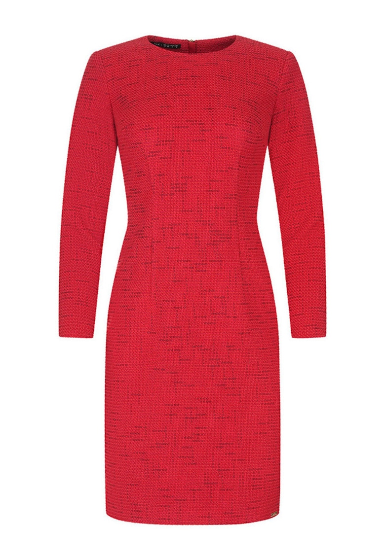 Характеристики Цвят: червен Стил: елегантен Материал: памук – изкуствена коприна Принт: без принт Кройка: права Дължина: средна Деколте: кръгло Дължина ръкав: дълъг ръкав Закопчаване: цип Състав Подплата: 100% полиестер