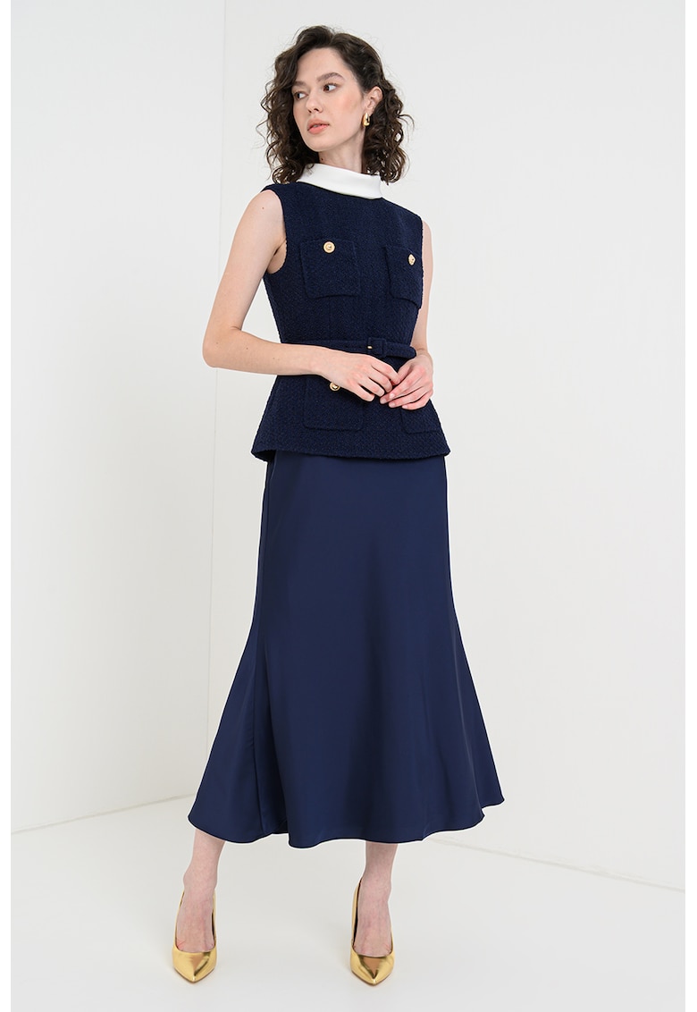 Характеристики Цвят: тъмносин Стил: елегантен Материал: полиестер – вълна – акрил Принт: без принт Кройка: веревна Дължина: средна Яка: ниска Дължина ръкав: без ръкав Талия: връзка Детайли: дизайн 2в1 – декоративни копчета Състав Външна част: 41% полиестер – 25% акрил – 24% вълна …