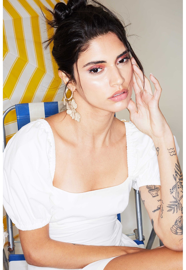Характеристики Цвят: бял – светлокафяв Стил: ежедневен Материал: памук Принт: без принт Кройка: клош Дължина: къса Деколте: квадратно Дължина ръкав: къс ръкав Закопчаване: без закопчаване Състав Външна част: 100% памук