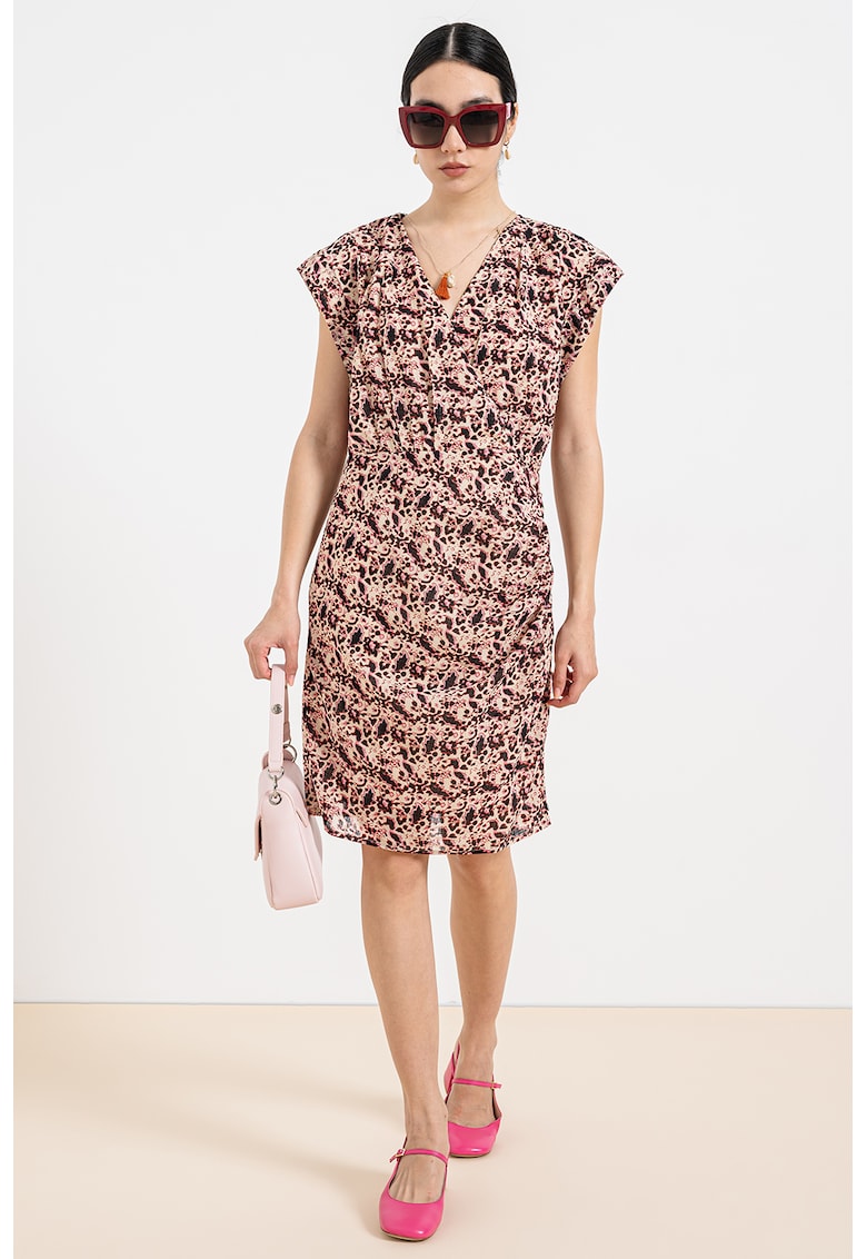 Характеристики Цвят: тъмновиолетов – мръснобял Стил: ежедневен Материал: синтетичен Принт: абстрактен Кройка: права Дължина: къса Деколте: шпиц Дължина ръкав: къс ръкав Състав Външна част: 97% полиестер – 3% еластан Информация за модел Моделът е облечен с размер S/36 EU. …