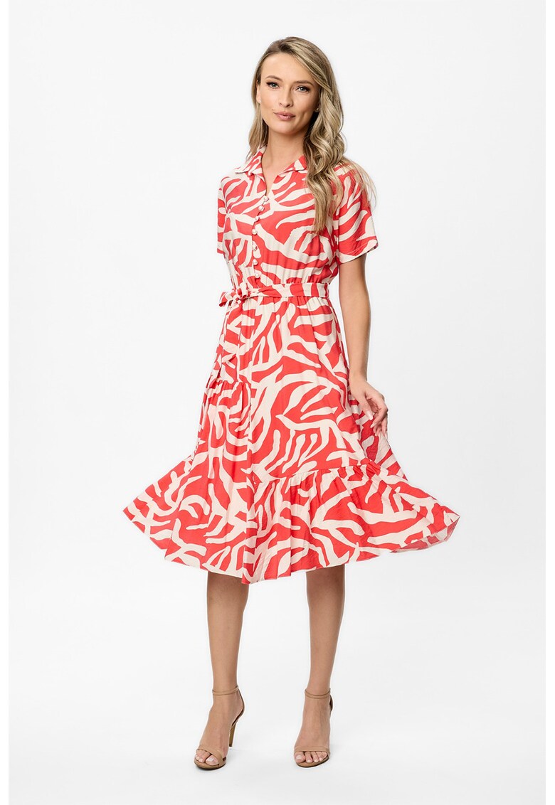 Характеристики Цвят: корал – крем Стил: ежедневен Материал: вискоза – полиамид Принт: графичен Кройка: клош Дължина: средна Деколте: шпиц Дължина ръкав: къс ръкав Детайли: набирания на подгъва – колан на талията Състав Външна част: 53% вискоза – 42% полиамид – 5% спандекс
