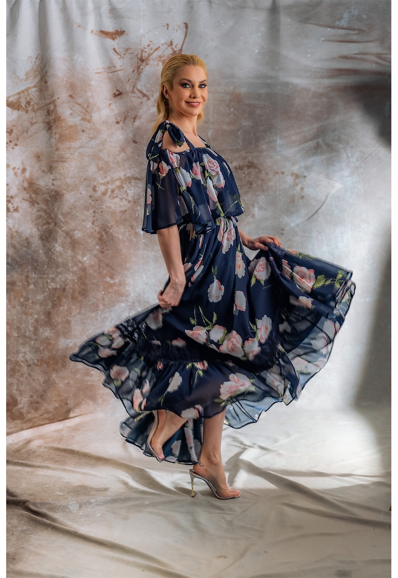 Характеристики Цвят: розова сьомга – тъмносин Стил: елегантен Материал: синтетичен – коприна Принт: флорален Кройка: разкроена – на едно рамо Дължина: дълга Деколте: право Дължина ръкав: средна Състав Външна част: 60% коприна – 40% полиестер