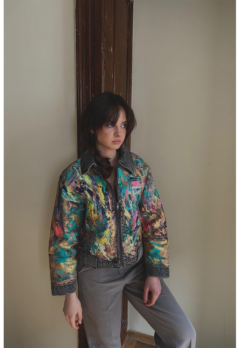 Ръчно рисувано късо яке от деним с цип – Сив/Син Tessuto