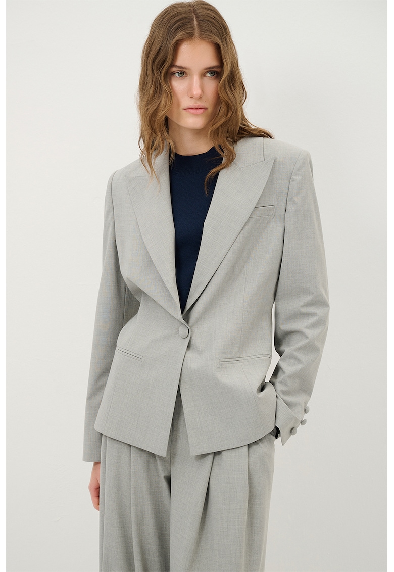 Характеристики Цвят: пепеляво сиво Стил: елегантен Кройка: стандартна Материал: полиестер – вискоза Принт: без принт Яка: заострени ревери Дължина ръкав: дълъг ръкав Закопчаване: копчета Състав Външна част: 63% полиестер – 31% вискоза – 6% еластан