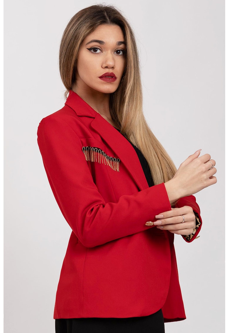 Характеристики Цвят: червен Стил: елегантен Кройка: стандартна Материал: полиестер Принт: без принт Яка: ревери с цепка Дължина ръкав: дълъг ръкав Закопчаване: копчета Състав Външна част: външна част: 95% полиестер – 5% еластан