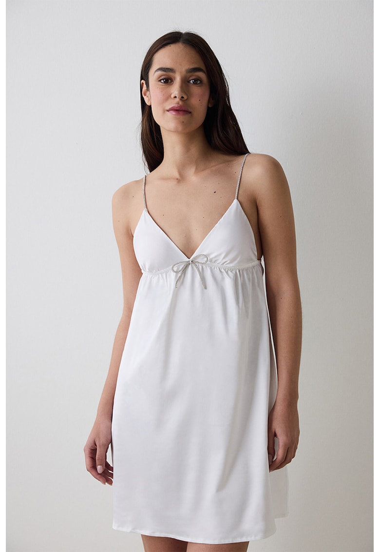 Характеристики Тип продукт: нощница Цвят: бял Материал: синтетичен – сатен Принт: без принт Деколте: шпиц Кройка: стандартна Презрамки: регулируеми Дължина ръкав: без ръкав Детайли: лъскави елементи Закопчаване: без закопчаване Състав Външна част: 98% полиестер – 2% …