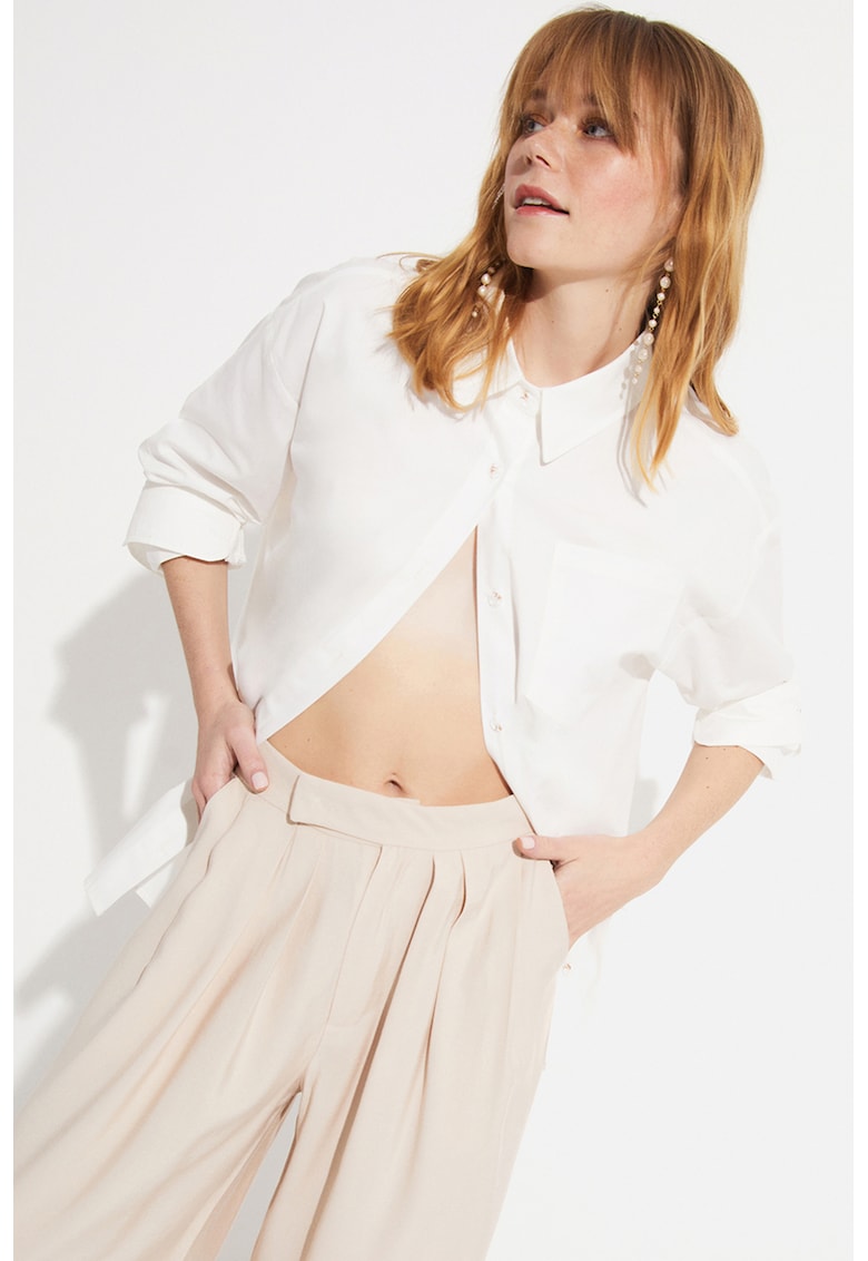 Характеристики Цвят: бял Принт: без принт Стил: елегантен Материал: памук Кройка: свободна Дължина ръкав: дълъг ръкав Джобове: 1 на гърдите Закопчаване: копчета Състав Външна част: 100% памук
