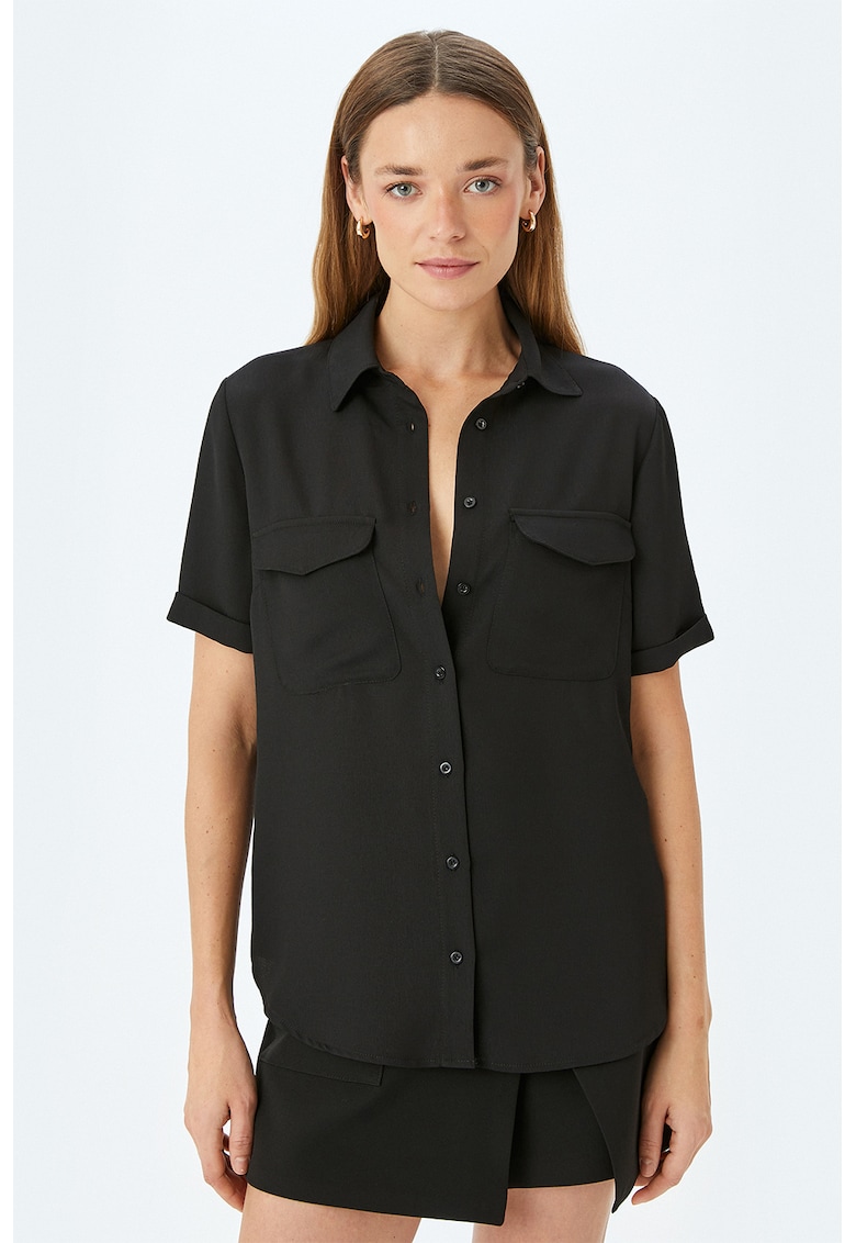 Характеристики  Цвят: черен Принт: без принт Стил: ежедневен Материал: синтетичен Кройка: свободна Яка: заострена Дължина ръкав: къс ръкав Джобове: 2 на гърдите Закопчаване: копчета  Състав  Външна част: 100% полиестер