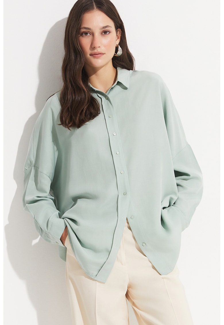 Характеристики Цвят: бледозелен Принт: без принт Стил: ежедневен Материал: лиосел Кройка: свободна Тип ръкав: паднали Дължина ръкав: дълъг ръкав Детайли: продуктът отговаря на размери s – m и l. моделът на снимката е обичайно с размер s. Закопчаване: копчета Състав Външна …