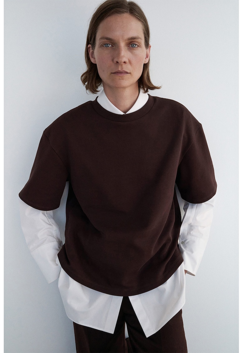 Характеристики Цвят: тъмнокафяв Принт: без принт Материал: полиестер – памук Кройка: свободна Модел: обло Дължина ръкав: къс ръкав Състав Външна част: 76% памук – 17% полиестер – 7% еластан