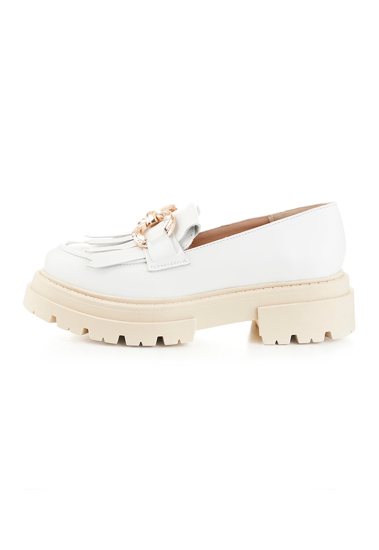 Характеристики Тип продукт: лоуфъри Цвят: бял Материал: синтетичен – eстествена кожа Принт: без принт Стил: ежедневен Връх: кръгъл Тип на подметката: скосена платформа Закопчаване: без закопчаване Състав Горна част: кожа – синтетика Материал интериор: кожа Материал …