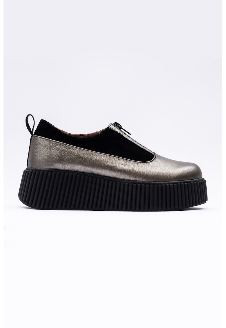 Характеристики Тип: с платформа Материал: eстествена кожа Цвят: тъмносребрист Принт: без принт Стил: ежедневен Връх: кръгъл Тип на подметката: скосена платформа Закопчаване: цип Състав Горна част: кожа Материал интериор: кожа Материал подметка: други материали