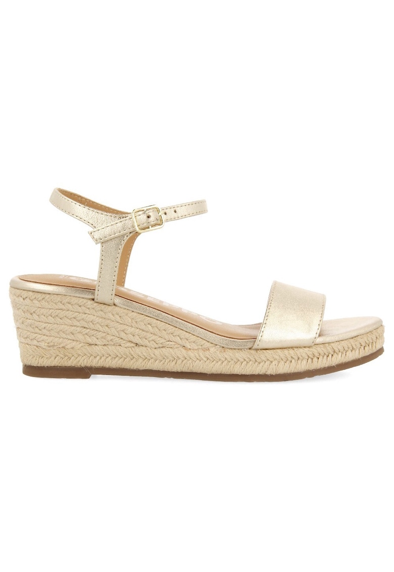 Характеристики Тип: с платформа Цвят: златист Материал: eстествена кожа Стил: ежедневен Тип на подметката: скосена платформа Закопчаване: катарама Състав Горна част: кожа Материал интериор: кожа Материал подметка: други материали