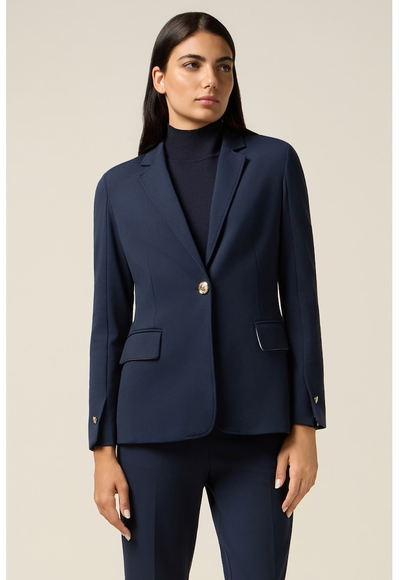 Характеристики Цвят: тъмносин Стил: елегантен Кройка: по тялото Материал: вискоза – полиамид Принт: без принт Дължина ръкав: дълъг ръкав Закопчаване: копчета Състав Външна част: 62% вискоза – 32% полиамид – 6% еластан Подплата: 100% полиестер