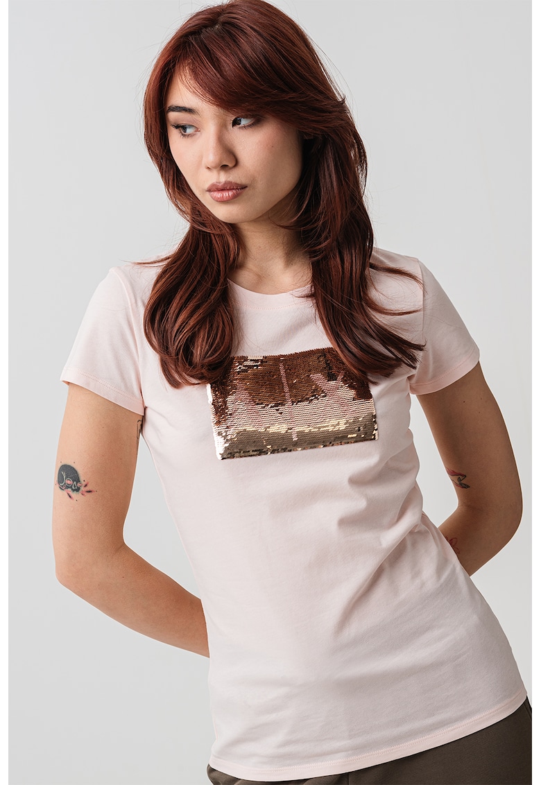 Характеристики Цвят: златист – бледо розово Принт: лого Материал: памук Кройка: по тялото Модел: овален Дължина ръкав: къс ръкав Състав Външна част: 100% памук Информация за модел Моделът е облечен с размер S. Размер на модела: 173 cm височина – 82 cm Гръдна обиколка – 65 cm Талия – 95 …