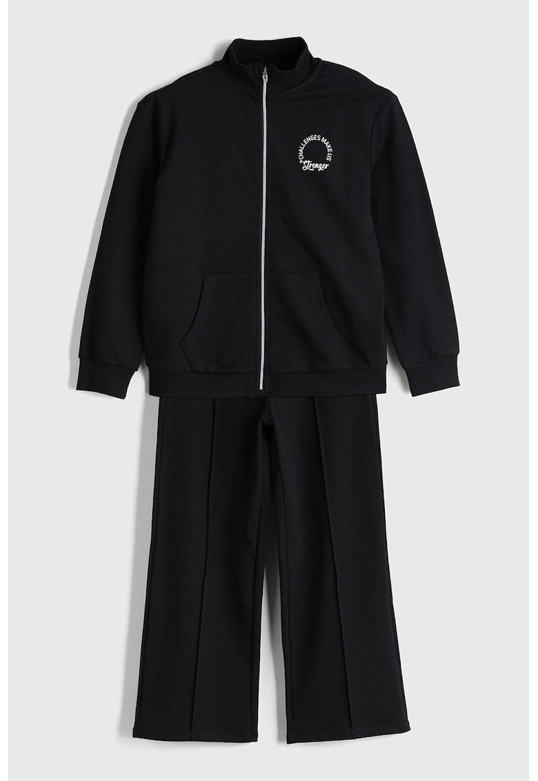 Характеристики Съдържание пакет: едно спортно яке и чифт спортен панталон Цвят: черен Принт: текст Материал: полиестер – памук Дължина ръкав: дълъг ръкав Дължина панталон: дълъг Закопчаване: цип Детайли: ръб отпред Състав Външна част: 79% памук – 21% полиестер