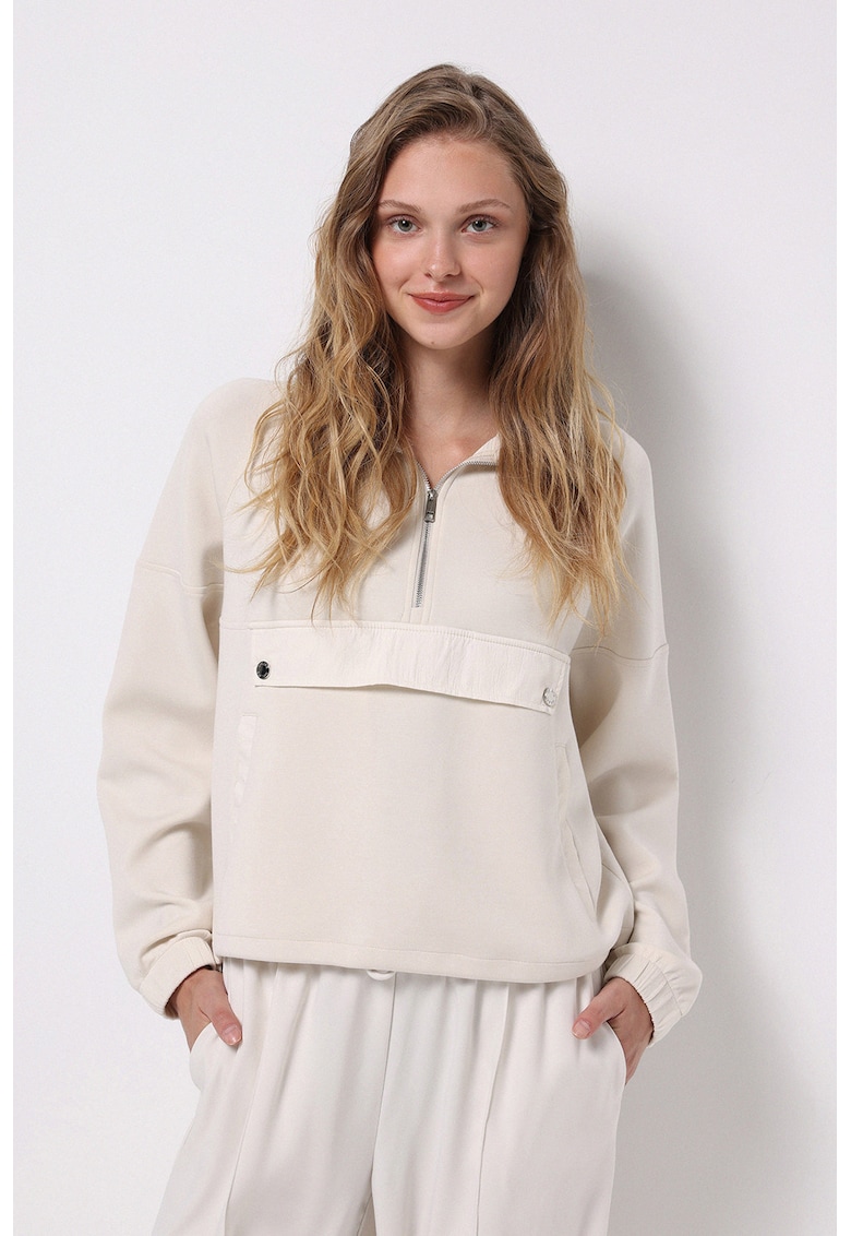 Характеристики Тип продукт: блузон Цвят: крем Принт: без принт Кройка: стандартна Закопчаване: без закопчаване Материал: полиестер – модал Дължина ръкав: дълъг ръкав Джобове: тип кенгуру Детайли: деколте с къс цип Състав Външна част: 50% модал – 44% полиестер – 6% еластан