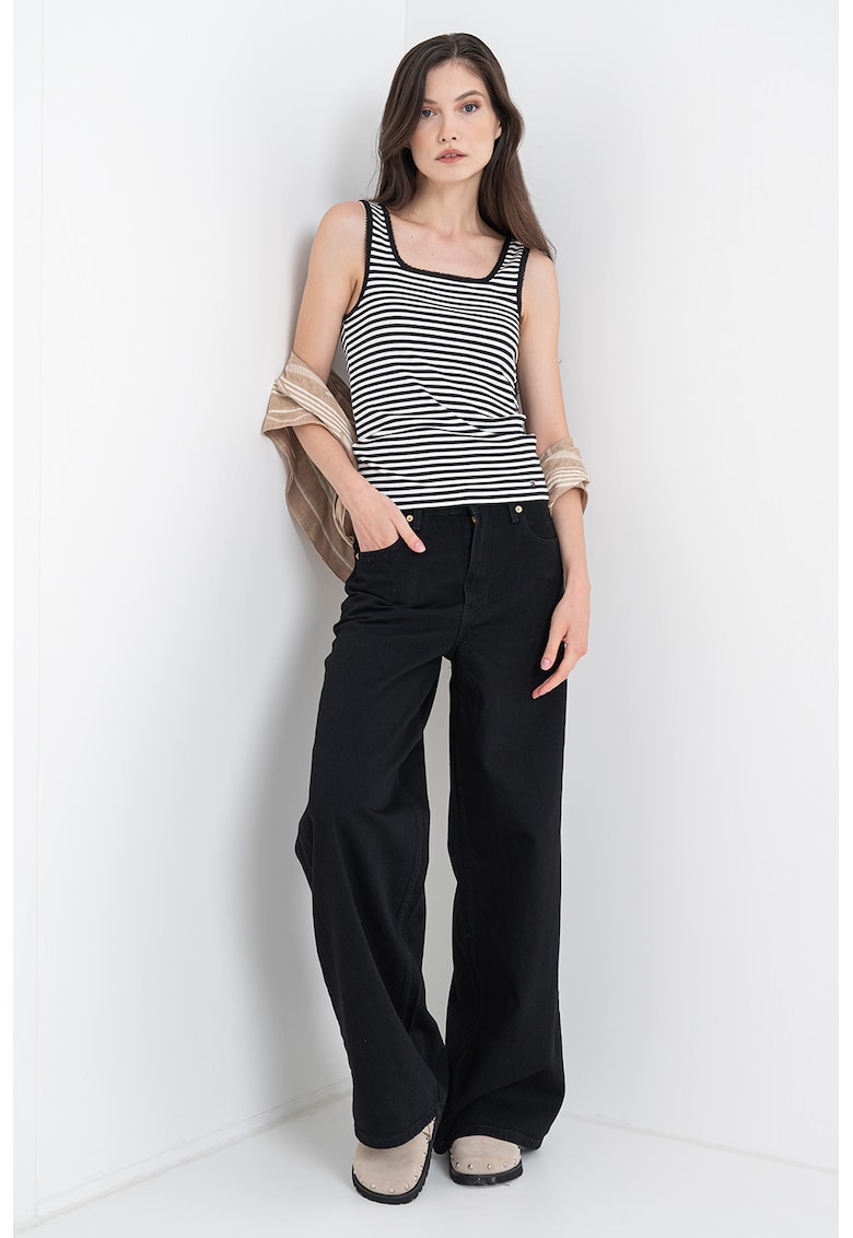 Характеристики Цвят: бял – черен Принт: райе Материал: вискоза Кройка: стандартна Модел: квадратна Дължина ръкав: без ръкав Състав Външна част: 95% вискоза – 5% еластан Информация за модел Моделът е облечен с размер S. Размер на модела: 176 cm височина – 78 cm Гръдна обиколка – 67 cm …