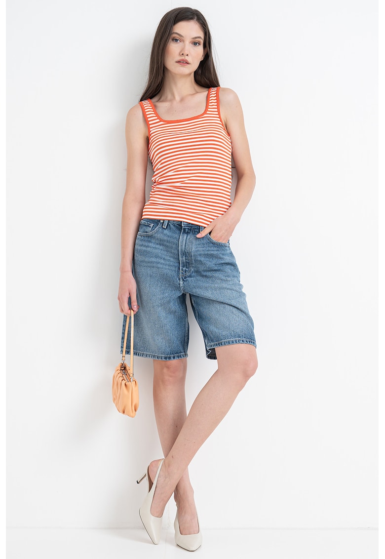 Характеристики Цвят: бял – мандарина Принт: райе Материал: вискоза Кройка: стандартна Модел: квадратна Дължина ръкав: без ръкав Състав Външна част: 95% вискоза – 5% еластан Информация за модел Моделът е облечен с размер S. Размер на модела: 176 cm височина – 78 cm Гръдна обиколка …