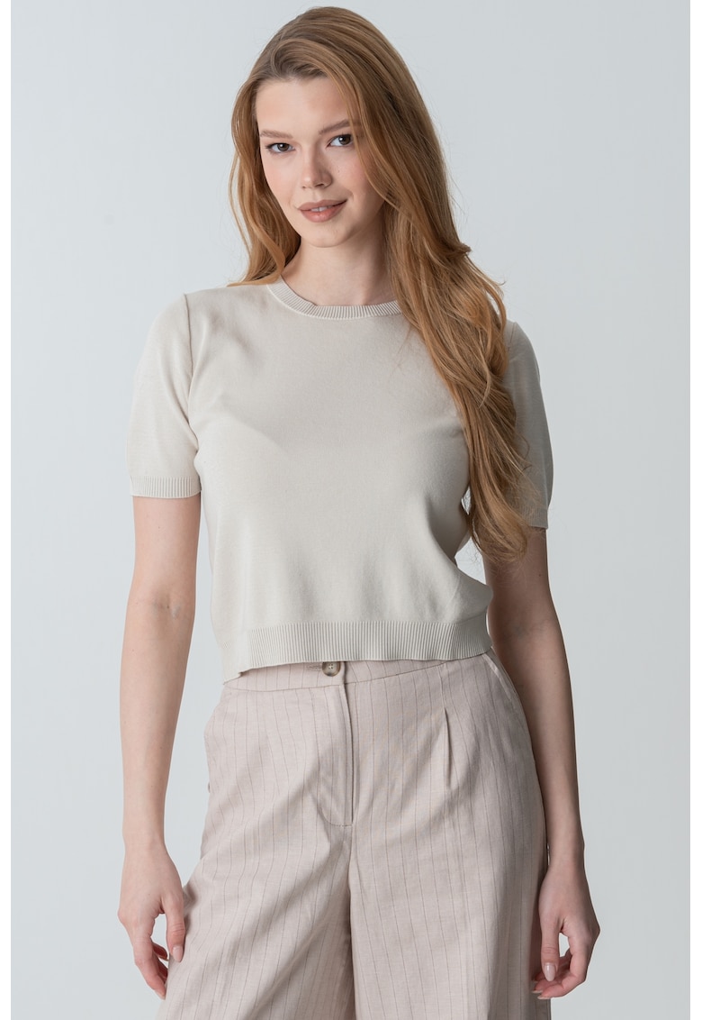 Характеристики Цвят: бежов Принт: без принт Материал: памук Кройка: стандартна Модел: обло Дължина ръкав: къс ръкав Състав Външна част: 100% памук Информация за модел Моделът е облечен с размер S. Размер на модела: 176 cm височина – 84 cm Гръдна обиколка – 64 cm Талия – 88 cm Ханш