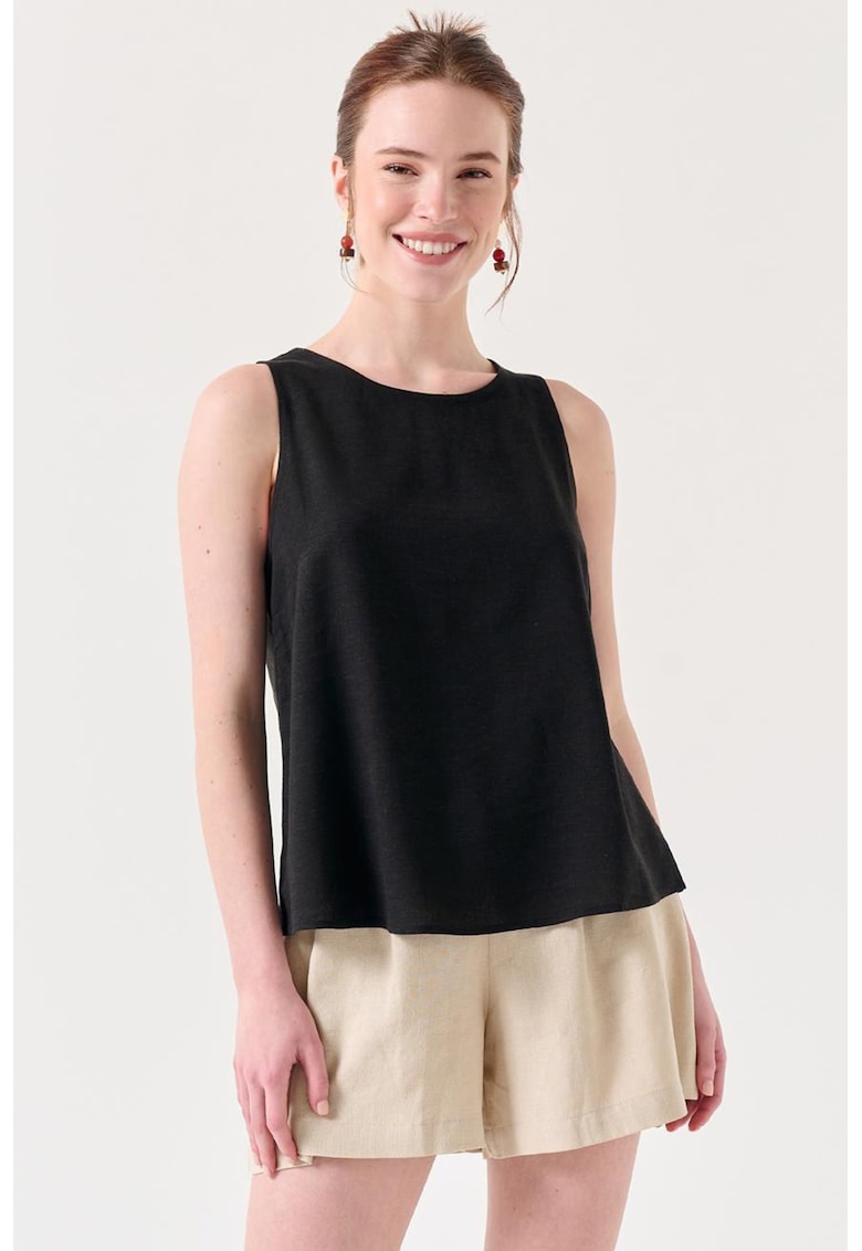 Характеристики Цвят: черен Принт: без принт Стил: ежедневен Кройка: стандартна Материал: вискоза – лен Деколте: овално Дължина ръкав: без ръкав Детайли: отвор на гърба Състав Външна част: 73% вискоза – 27% лен Информация за модел Моделът е облечен с размер S. Размер на …