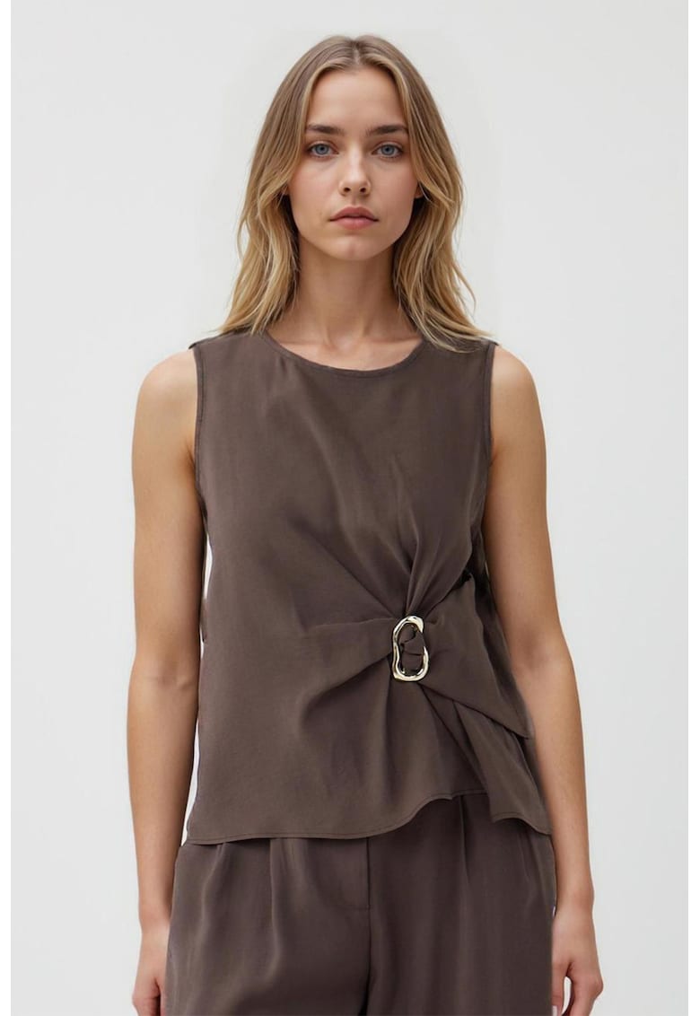 Характеристики Цвят: кафяв Принт: без принт Стил: ежедневен Кройка: стандартна Закопчаване: без закопчаване Материал: полиестер – модал Деколте: кръгло Дължина ръкав: без ръкав Детайли: набирания с каишка с тока Състав Външна част: 86% модал – 14% полиестер