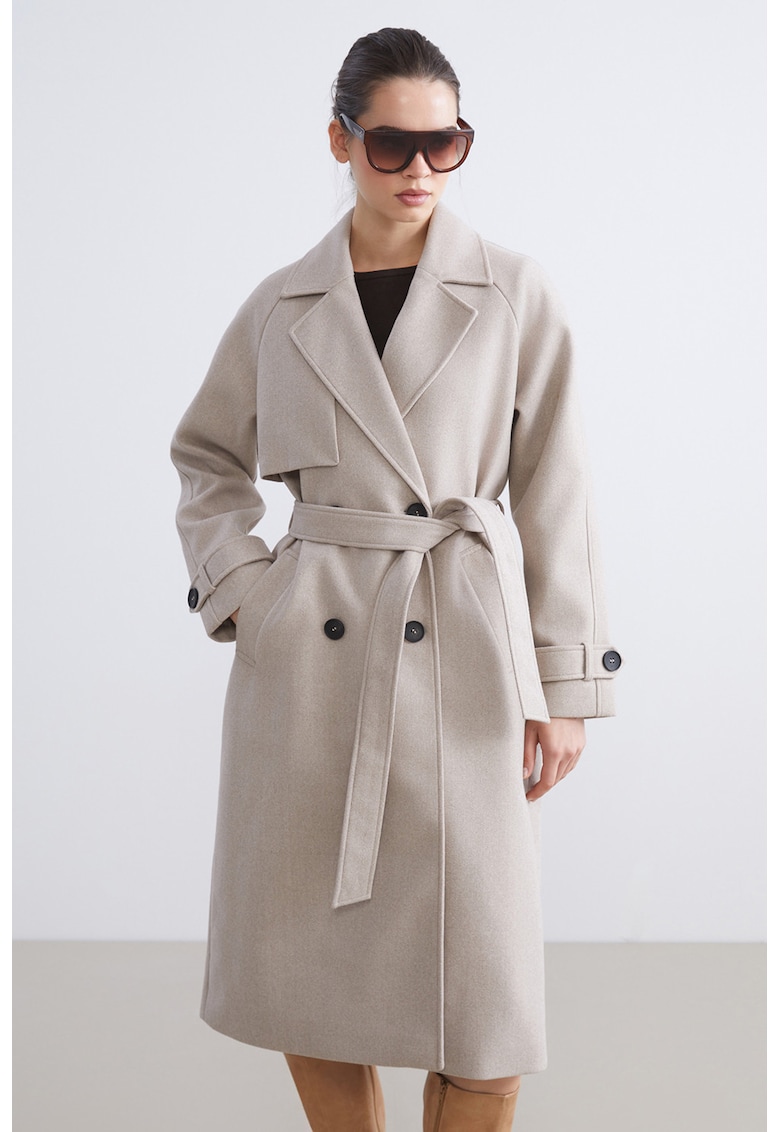Характеристики Тип продукт: тренч Цвят: сиво-бежов Принт: без принт Стил: елегантен Материал: полиестер Кройка: стандартна Яка: ревери с цепка Дължина ръкав: дълъг ръкав Джобове: 2 скосени Закопчаване: копчета – колан Състав Външна част: 100% полиестер Подплата: 100% …