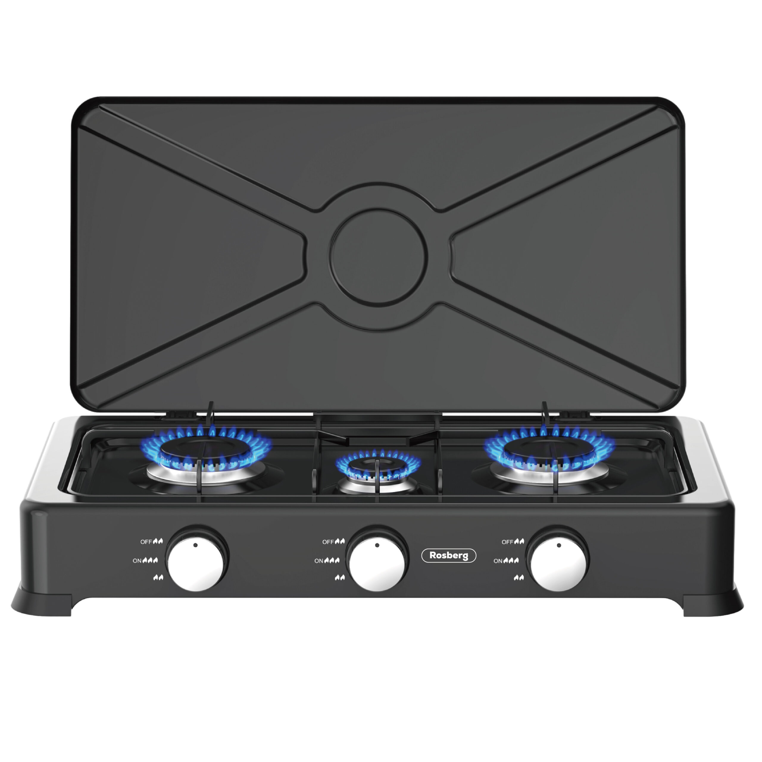 Троен газов котлон с капак Rosberg R51454E3, 3х2.2 kWh, 30 mbar, Въглеродна стомана, Черен на най-добра цена.