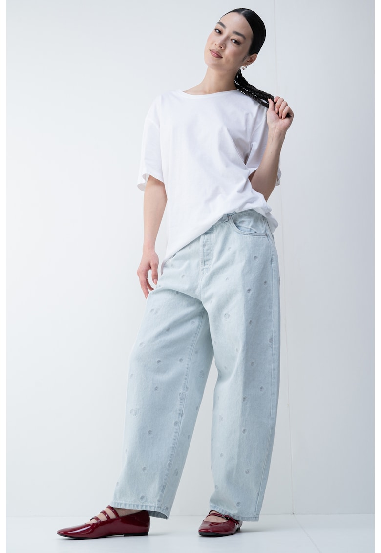 Характеристики Цвят: ледено синьо Принт: без принт Кройка: свободна Материал: памук Талия: висока Дължина: дълъг Джобове: 5 Състав Външна част: 100% памук Информация за модел Моделът е облечен с размер W27-L30. Размер на модела: 170 cm височина – 78 cm Гръдна обиколка – 60 cm Талия – 99 cm …