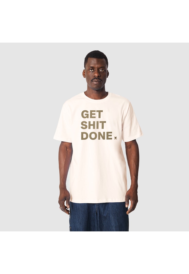 Характеристики Цвят: крем Принт: текст Материал: памук Кройка: свободна Модел: обло Дължина ръкав: къс ръкав Състав Външна част: 84% памук – 16% полиестер