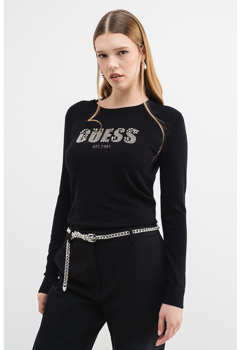 Относно Фино плетен пуловер с лого – Черен/Сребрист GUESS