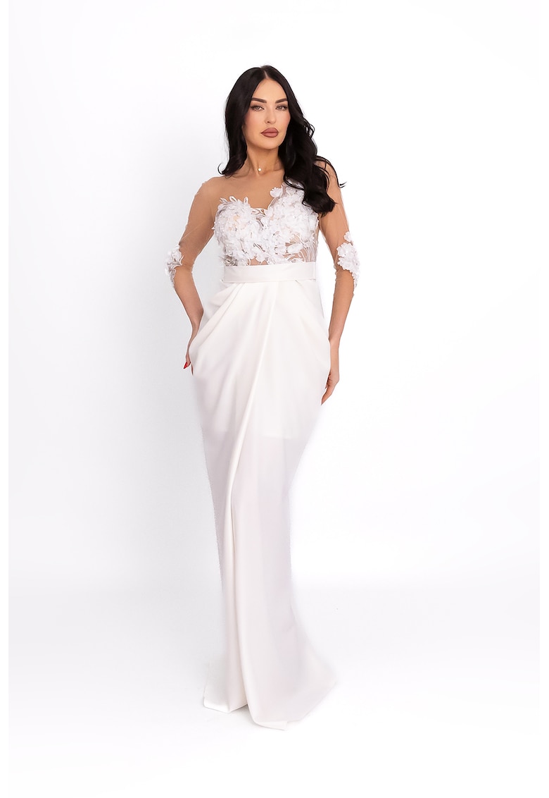 Характеристики Цвят: бял Стил: за повод Материал: синтетичен – тюл Принт: без принт Кройка: русалка Дължина: дълга Деколте: сърцевидно Дължина ръкав: три четвърт Детайли: цепка отпред Закопчаване: цип Състав Външна част: 100% полиестер Подплата: 90% полиестер – 10% еластан