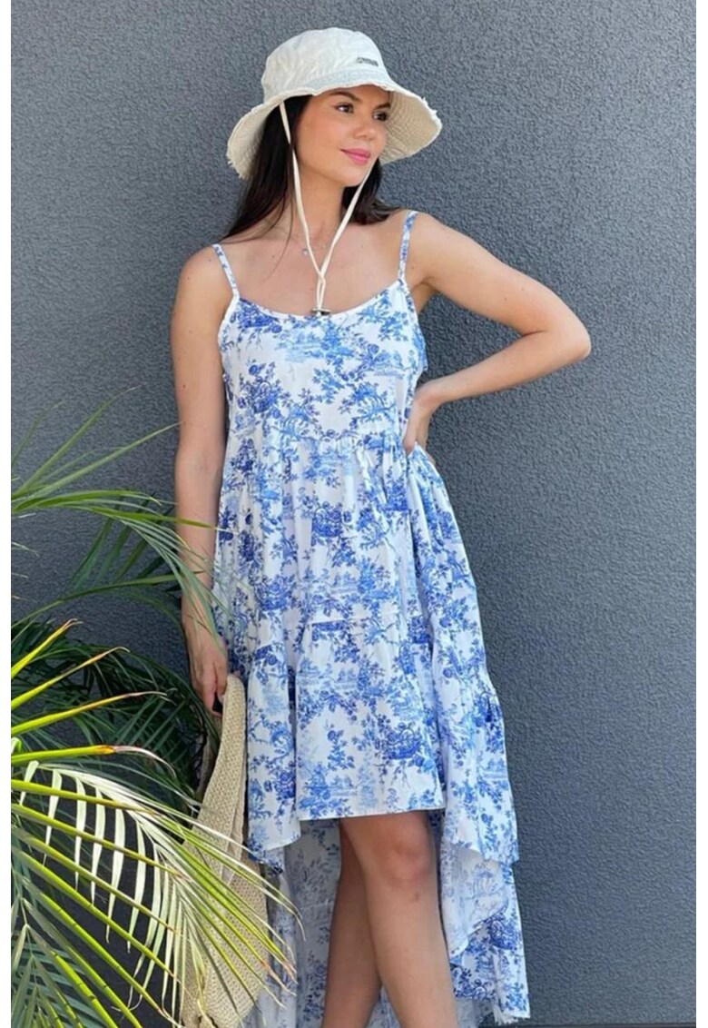 Характеристики Цвят: бял – син Стил: ежедневен Материал: памук Принт: флорален Кройка: асиметрична Дължина: къса Дължина ръкав: без ръкав Състав Външна част: 100% памук