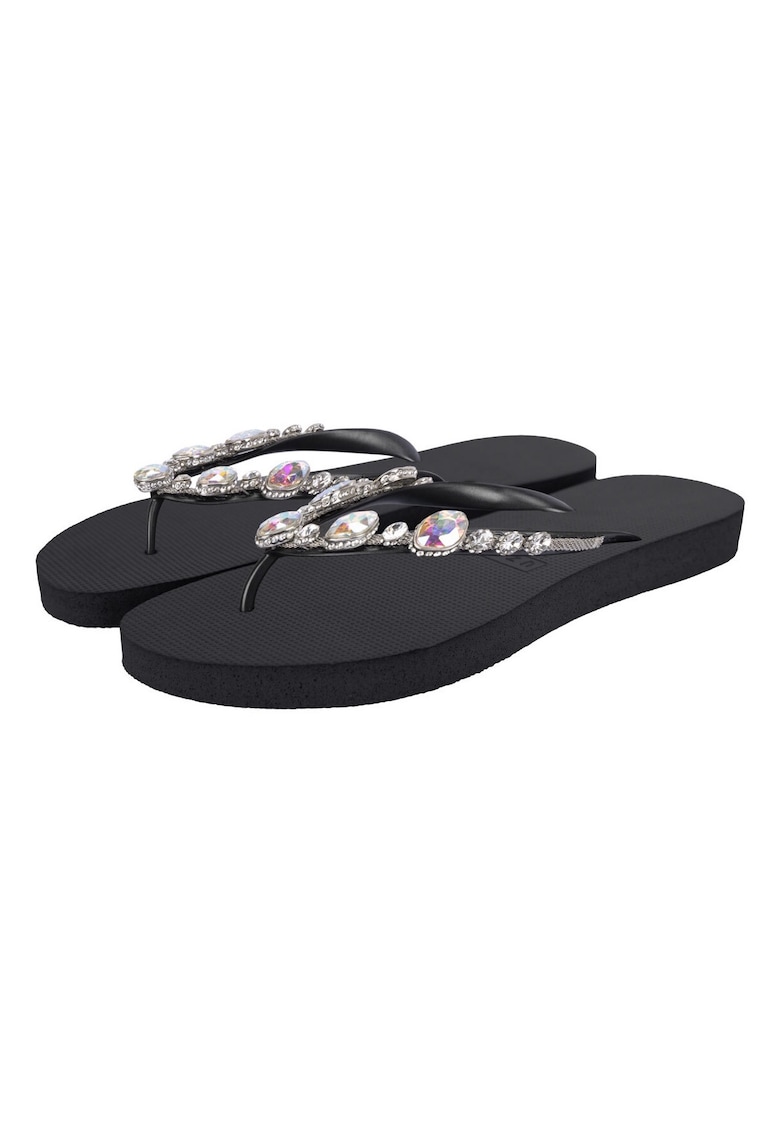 Характеристики Тип продукт: плажни чехли Цвят: черен Материал: синтетичен Стил: ежедневен Принт: без принт Връх: кръгъл Тип на подметката: плоска Детайли: непромокаемост – апликация с декоративни камъни Състав Горна част: други материали Материал интериор: други …