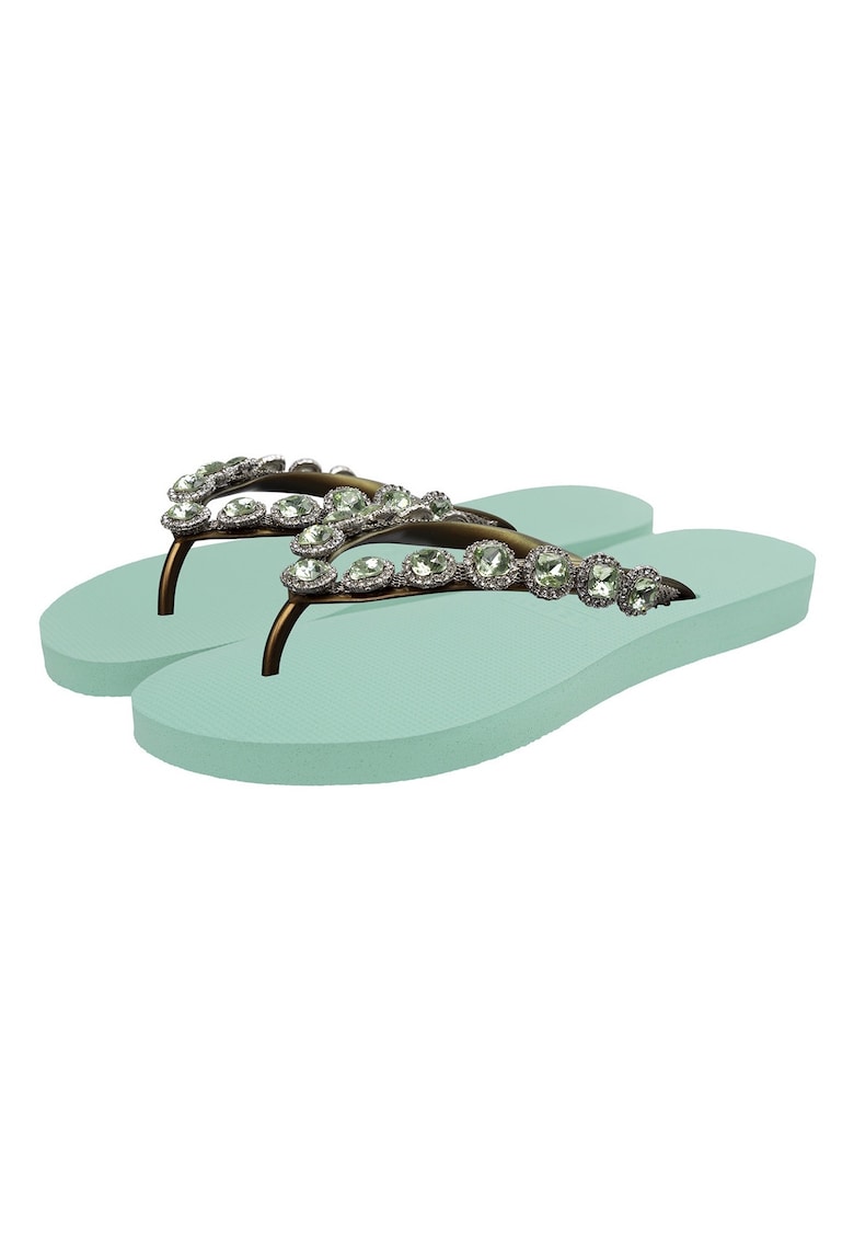 Характеристики Тип продукт: плажни чехли Цвят: ментово зелено Материал: синтетичен Стил: плажен Принт: без принт Тип на подметката: плоска Детайли: декоративни камъни Състав Горна част: други материали Материал интериор: други материали Материал подметка: други …