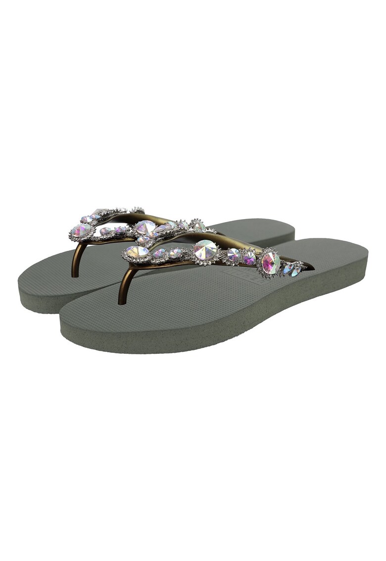 Характеристики Тип продукт: плажни чехли Цвят: зелен Материал: каучук Стил: ежедневен Принт: без принт Връх: кръгъл Тип на подметката: плоска Детайли: кристал Състав Горна част: други материали Материал интериор: други материали Материал подметка: други материали