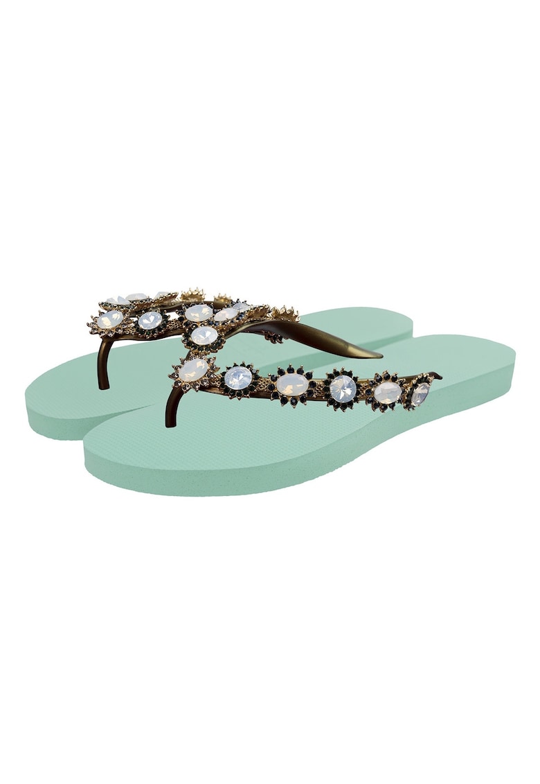 Характеристики Тип продукт: плажни чехли Цвят: ментово зелено Материал: каучук Стил: ежедневен – плажен Тип на подметката: плоска Детайли: непромокаемост Състав Горна част: гума Материал интериор: други материали Материал подметка: други материали
