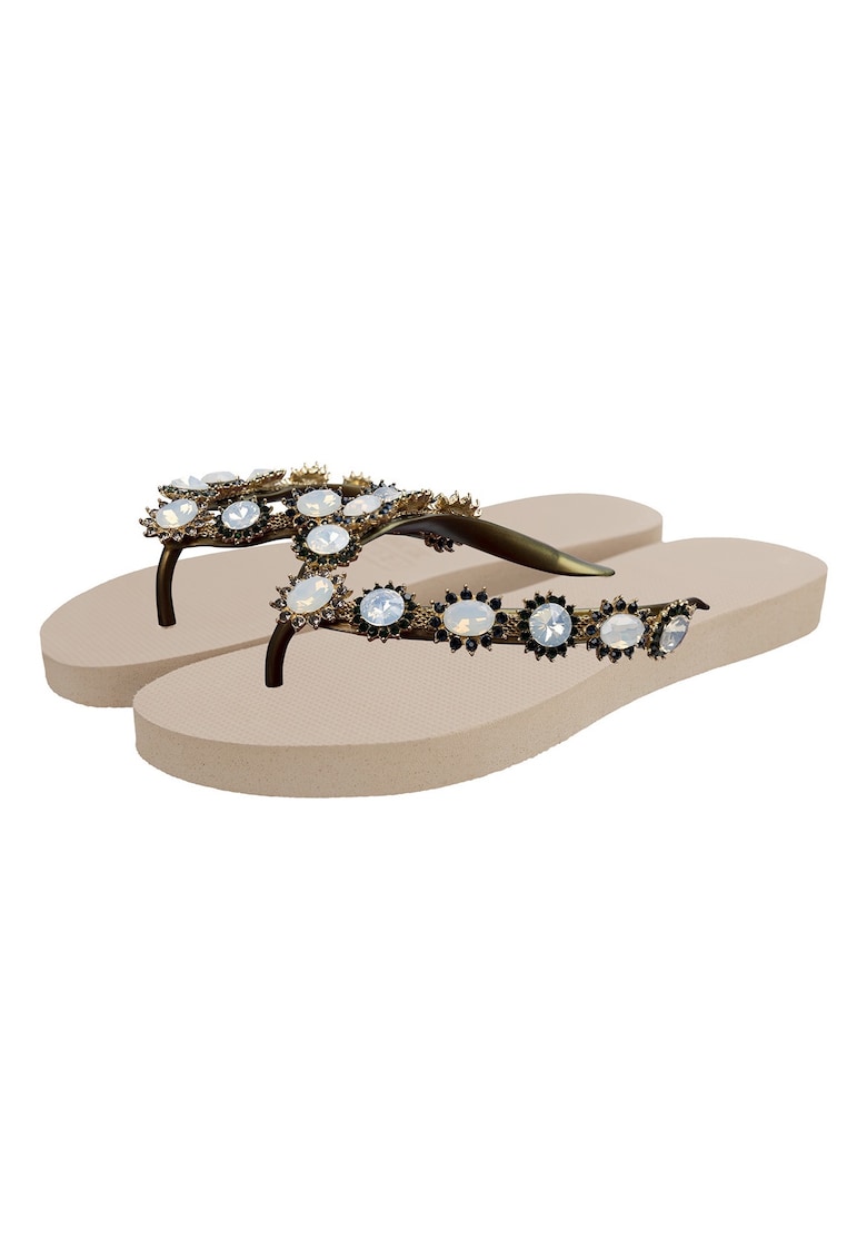 Характеристики Тип продукт: плажни чехли Цвят: бежов Материал: каучук Стил: ежедневен – плажен Тип на подметката: плоска Детайли: непромокаемост Състав Горна част: гума Материал интериор: други материали Материал подметка: други материали