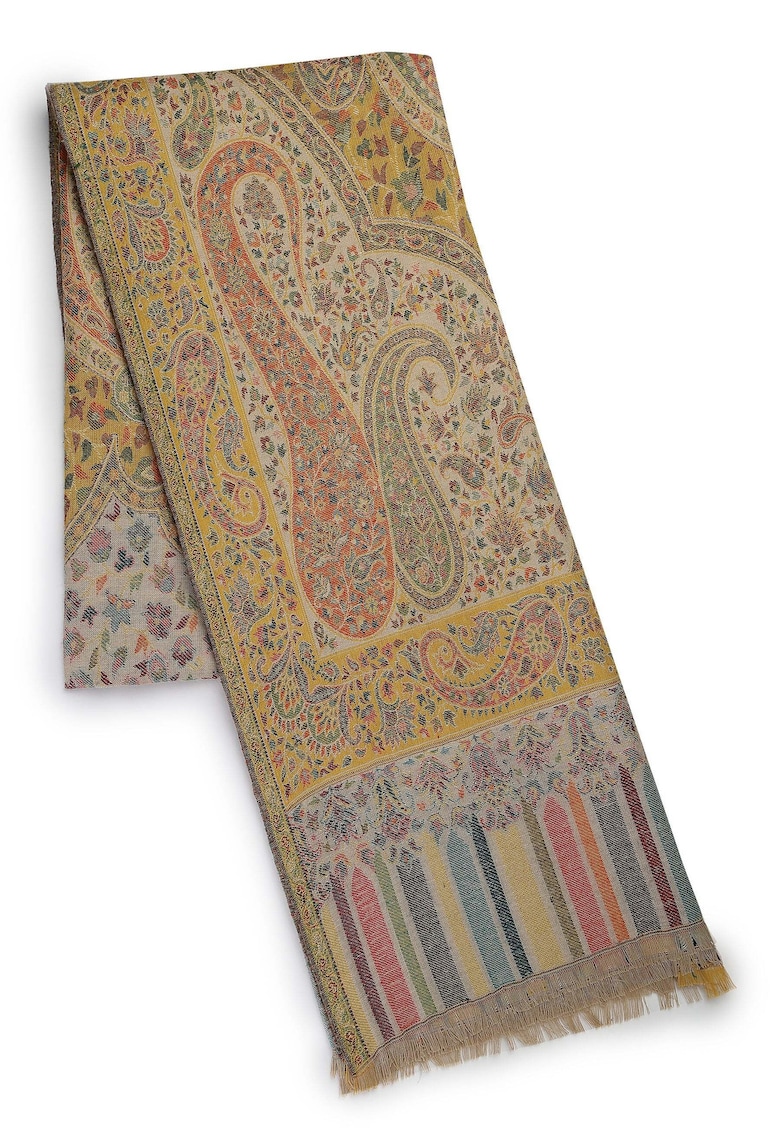 Характеристики Тип продукт: тънък шал Цвят: многоцветен Стил: ежедневен Сезон: есен-зима Принт: етнически Материал: полиестер – вълна Детайли: ресни по краищата Състав Външна част: вълна – полиестер Размери Размери (см): 75×195