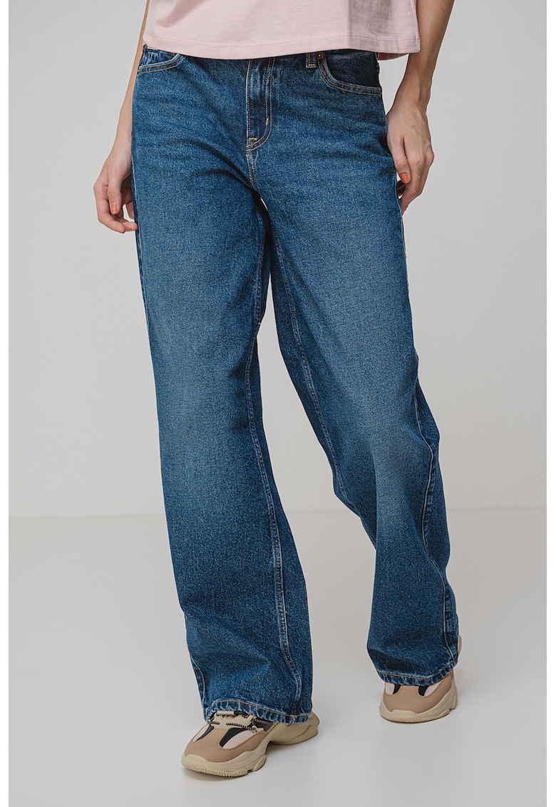 Характеристики Цвят: тъмносин Принт: без принт Кройка: широк крачол Материал: дънков плат Талия: средновисока Дължина: дълъг Джобове: 5 Закопчаване: цип Състав Външна част: 99% памук – 1% еластан Информация за модел Моделът е облечен с размер W27-L32. Размер на модела: 175 cm …