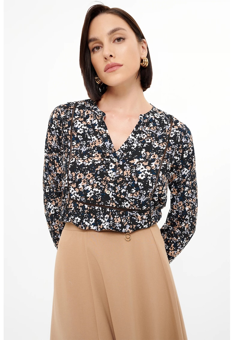 Характеристики Цвят: бял – черен – бежов Принт: флорален Стил: ежедневен Кройка: свободна Закопчаване: без закопчаване Материал: вискоза Деколте: шпиц Дължина ръкав: дълъг ръкав Състав Външна част: 100% вискоза