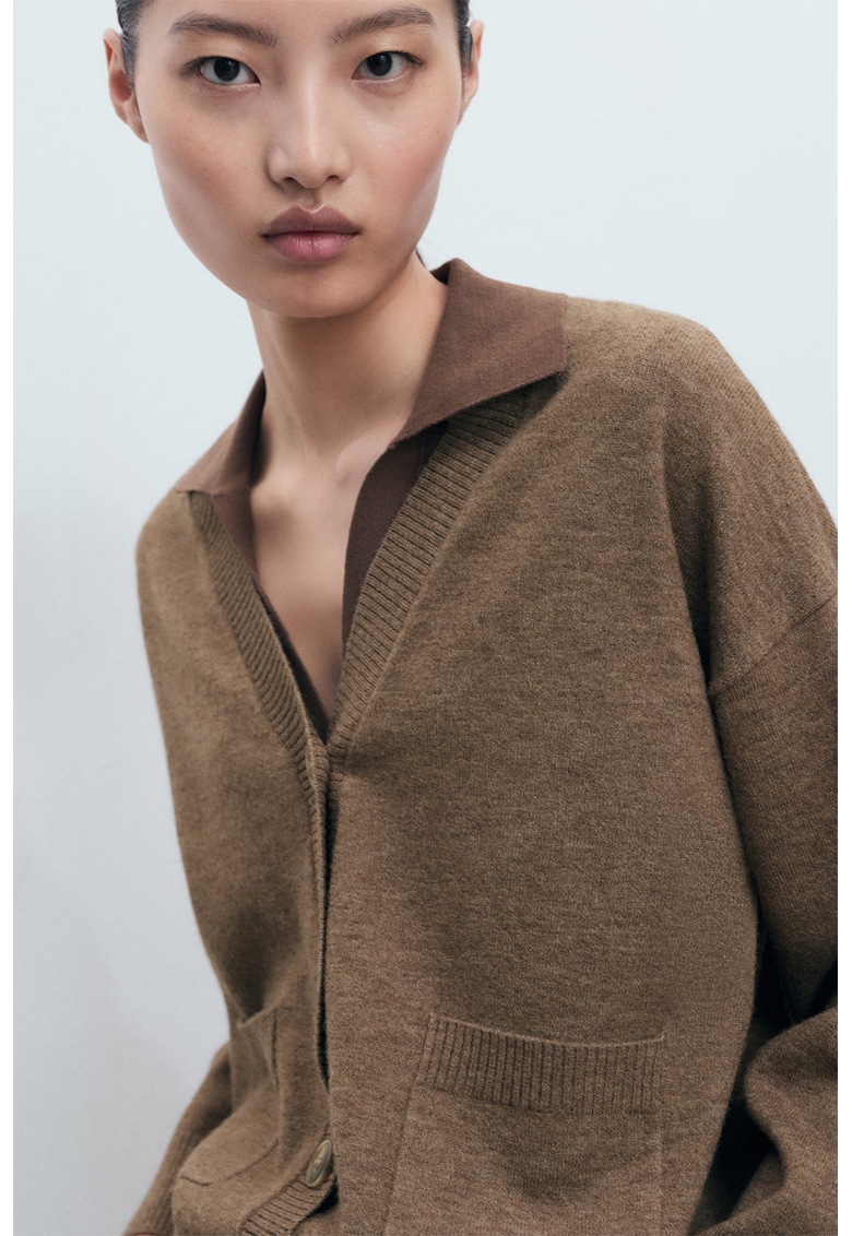 Характеристики  Тип продукт: жилетка Цвят: сиво-кафяв Принт: без принт Материал: полиестер – вълна – полиамид – акрил Модел: v-образно деколте Кройка: свободна Закопчаване: копчета Деколте: рипс Дължина ръкав: дълъг ръкав Тип ръкав: свободнопадащ Джобове: 2 пришити  Състав …