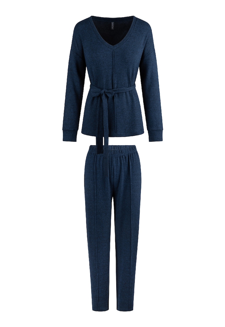 Характеристики Тип продукт: пижама Цвят: тъмносин Материал: полиестер – еластан Принт: без принт Деколте: в v“ Дължина ръкав: дълъг ръкав Дължина панталон: дълъг Състав Външна част: еластан – полиестер“
