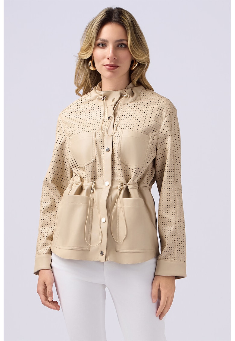 Характеристики Тип продукт: яке Цвят: camel Принт: без принт Материал: екологична кожа Кройка: стандартна Яка: ниска Качулка: без качулка Дължина ръкав: дълъг ръкав Закопчаване: капси Състав Външна част: 100% полиестер