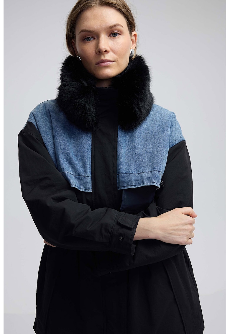 Характеристики Тип продукт: яке Цвят: черен – син меланж Принт: без принт Материал: синтетичен – памук – дънков плат – изкуствена козина Дължина: къса Кройка: стандартна Яка: висок Качулка: без качулка Ръкави: регулируем маншет с капси Дължина ръкав: дълъг ръкав Джобове: с …